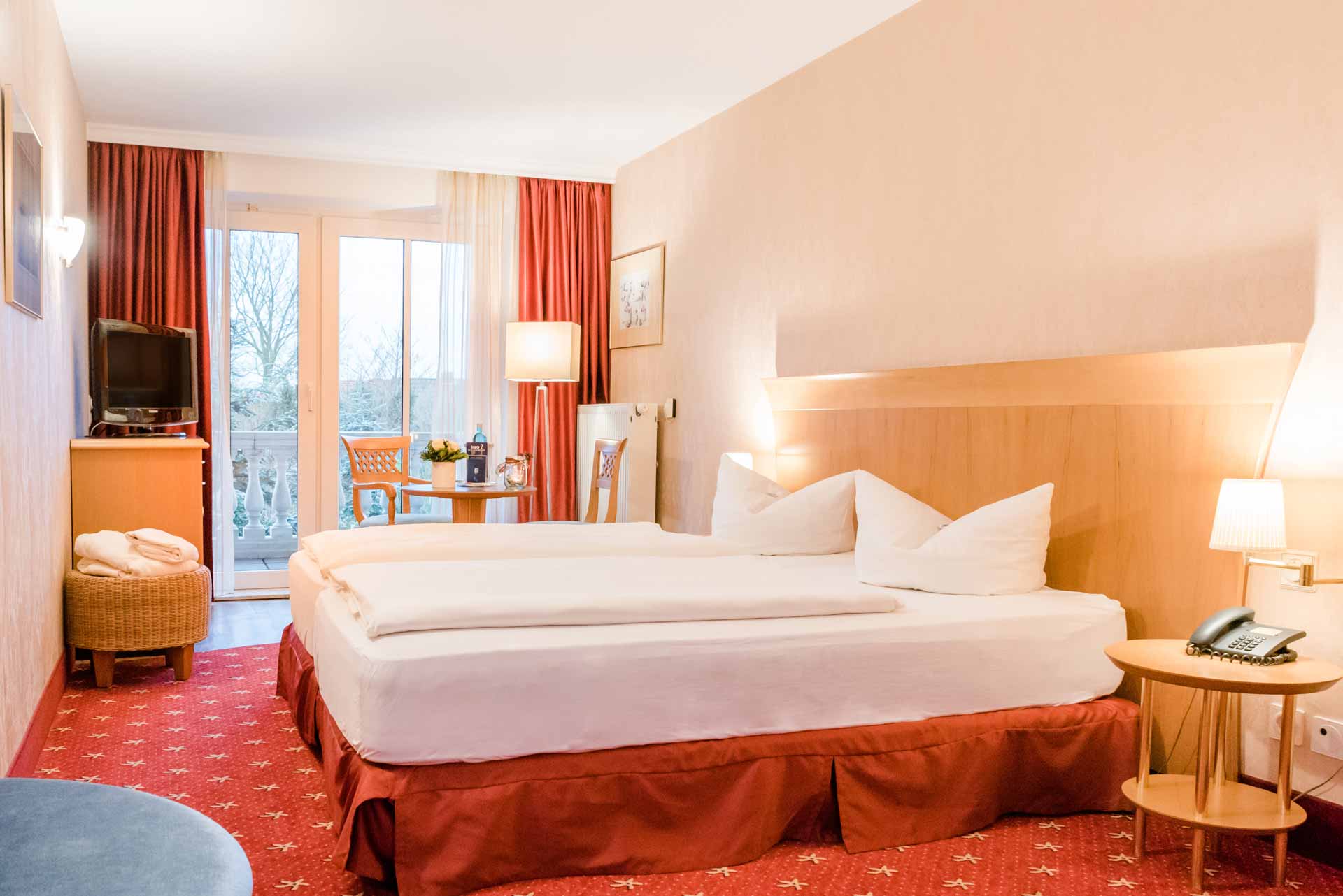 Zimmer mit Balkon: Viele Zimmer im Hotel Leuchtfeuer Horumersiel verfügen über einen Balkon mit Blick auf den Park. Genießen Sie den Sonnenaufgang über der Nordsee am Hafen von Horumersiel.